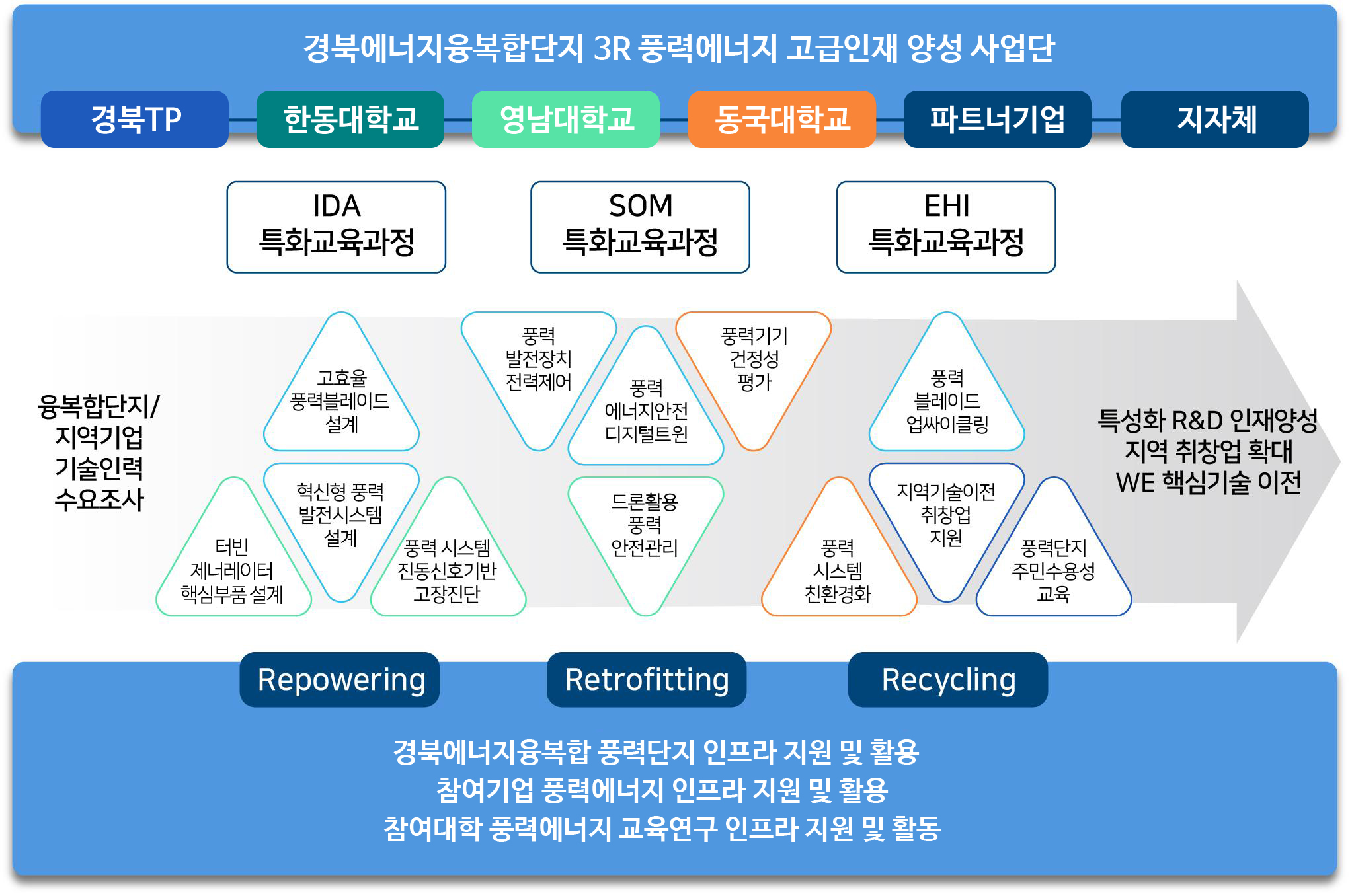 - 풍력에너지 인재양성과 기술자립/고도화를 위해 기술/인력 수요기반으로 3대 핵심 특성화 분야 및 10대 프로젝트를 도출하여 석박사과정, 재직자 역량 강화 과정 개설 및 운영
