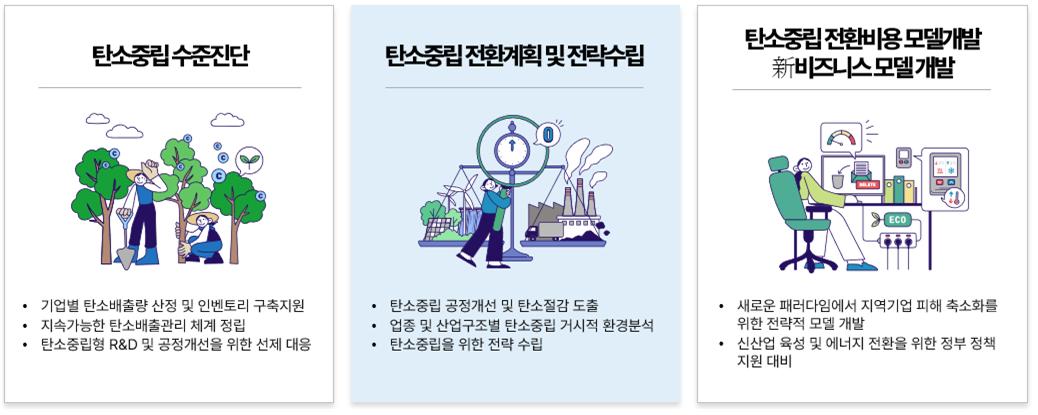 - 공정전환 기업 컨설팅 지원 : 탄소중립 수준진단, 전환비용 조사, 탄소중립 전환계획 및 전략 수립, 新비즈니스 모델 개발